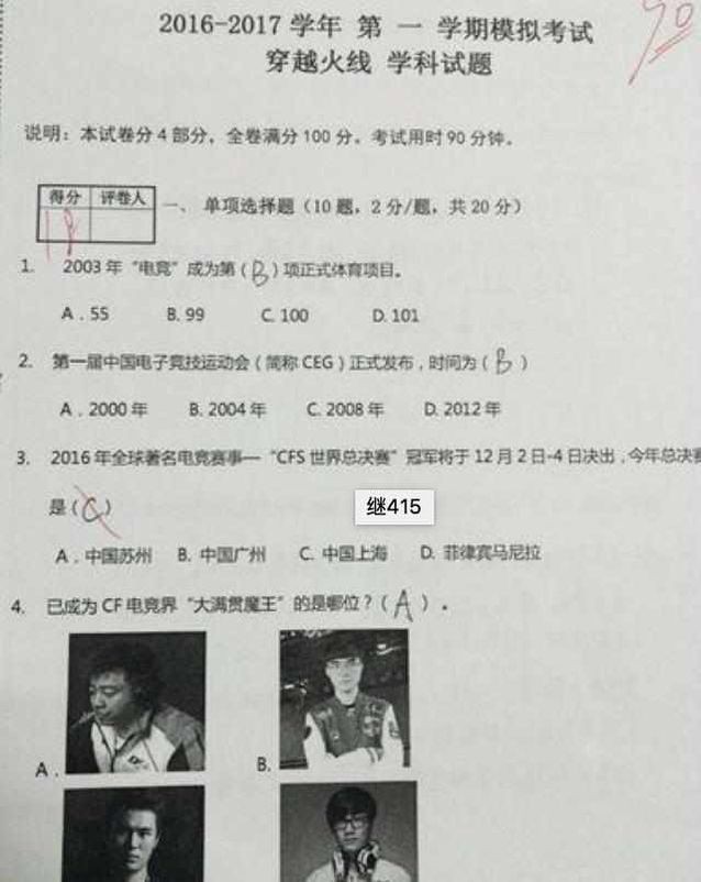 早在教育部将电竞加入增补专业名单前一个月,内蒙古锡林郭勒职业学院已经设立了国内首个电竞专业,学制两年结业后可以授予中专学历。11月有多名已经加入电竞专业的学生在网上晒出了自己的考试试卷,一位名叫何金铎的同学上传了《英雄联盟》的科目试卷,此后又有一名父亲上传了他儿子在《穿越火线》科目中的试卷,《炉石传说》的试卷也在随后曝光。虽然三张试卷分数有高低之别,但从题目的设置情况来看,试卷类型都是以普通课程类似,选择、填空、简答、分析题不一而足,内容多是与游戏和电竞赛事相关的知识点。