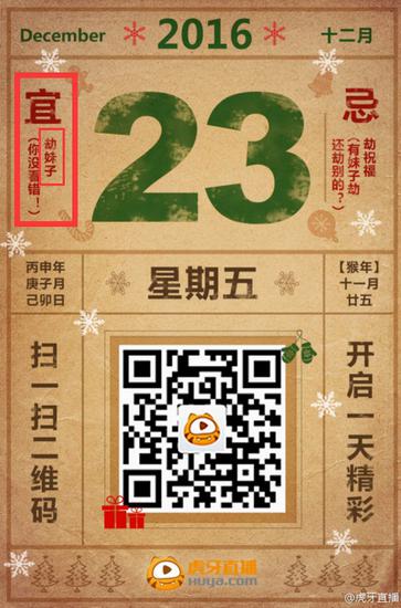 果真虎牙直播圣诞节的福利就是与众不同,史上最奇葩的圣诞节礼物没有之一,连女主播都敢送,看的小编蠢蠢欲动。同样是单身狗的你还在等什么?这个圣诞节不再寂寞,去虎牙直播劫个女神过圣诞,让我们一起度过这个难忘的圣诞节!