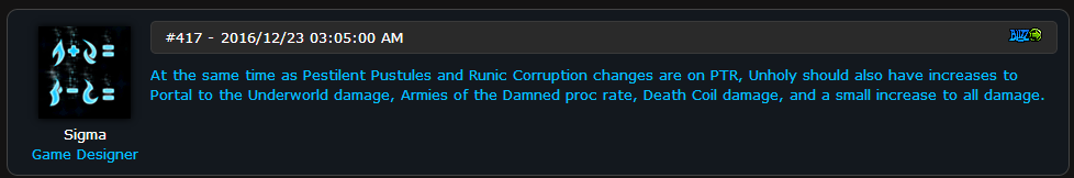如我们之前所说,PTR服务器中脓疮传染和符文腐蚀改动的同时,我们也已经提高了通往灵界的传送门(食尸鬼爆炸小特质)、凋零缠绕的伤害,增加了诅咒大军(食尸鬼普攻叠加4种Debuff)的触发几率,以及全技能伤害的小提升。