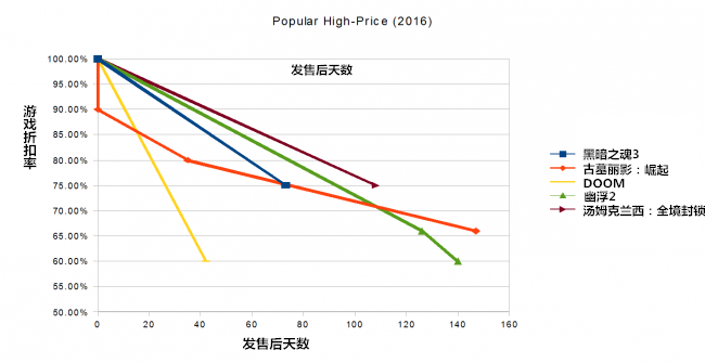 姗姗来迟的《古墓丽影:崛起》一发售就直接跳水至9折结论:由于时间跨度的原因,我们缺少一些2016年高价游戏的折扣数据,所以我们很难总结出任何可靠完整的结论,但是根据图表的数据来看,似乎与前几年也是“不谋而合”的。33%折扣这一档目前定格在了平均137天这个数字,这个数字与2015年的平均天数(106天)相差并不是很大。但是其他折扣档的差异就比较大了,但这可能是因为我们数据不足,要是折扣数据再充足一些的话,想必也不会差太多的。