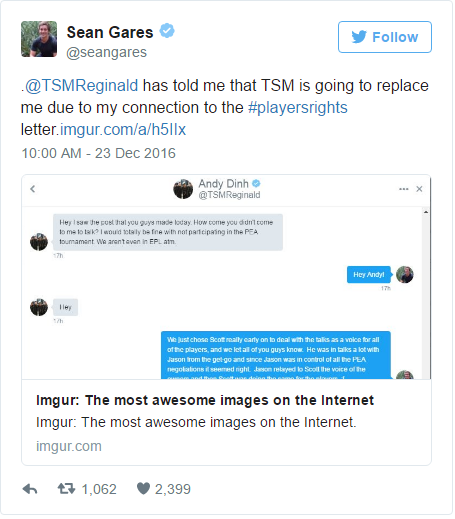 这位在一周前刚刚加入TSM的选手因先前发的抗议信——对于PEA阻止北美队伍参加EPL的抗议——而被TSM管理层踢出。