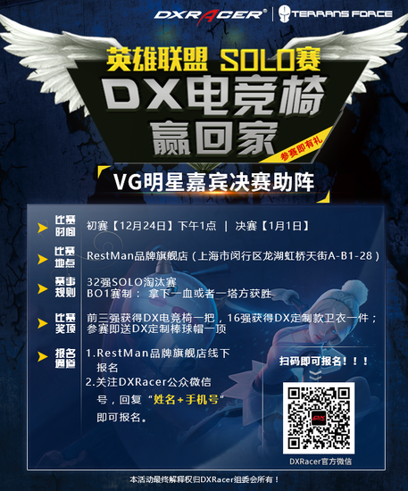 此外,锐斯曼RestMan首次英雄联盟SOLO赛火热招募中!报名参赛即可获得DX定制棒球帽一顶,16强可获得DX定制款卫衣一件,前三强都可获得DX电竞椅一把。比赛现场采取32强SOLO淘汰赛,BO1赛制:拿下一血、一百刀或者一塔方获胜。12月24日初赛将开场,小伙伴赶紧报名哦!没来得及参加的VG粉丝,也可以元旦现场报名。挑战擂主,赢取丰厚礼品。