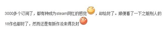 “3000多个订阅了,都有种成为steam网红的感觉,却给封了。顺便看了一下之前别人的18作也都封了,然而还是有新作没来得及封。”