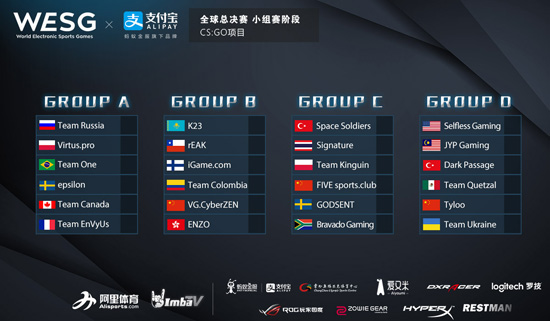 欧洲区冠军队伍Team Dignitas因赛事赛程与战队自身原因弃权本次比赛,考虑到时间与签证因素,其名额将由原欧洲赛区9-12名战队epsilon顶替;同时原欧洲赛区CS:GO项目亚军Team Russia递补为欧洲赛区冠军,与其他三个洲际赛区冠军一同作为种子队伍落入四个小组,具体分组名单如上图所示。