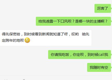 拥有三千亿核弹粉的B皇8月份才签的火猫,并且看火猫的动作特别重视窝B,而且合同在身,B神也不大可能在年后换平台。其他的主播都有可能在新年有新的动向。而且就在昨天,有个朋友告诉小编,火猫已经抢先一步行动了。废话不多说,先放聊天记录↓