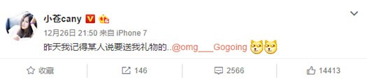 苍姐和大哥GOGOING的关系一直让粉丝操碎了心,不管苍姐有多么次主动的向大哥抛出橄榄枝,大哥却总是不接招又不拒绝,私下又和苍姐勾搭得风生水起。比如12月26日苍姐发微博AT大哥,找他拿答应送给自己的礼物。
