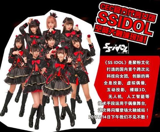 《SS IDOL》是聚粉文化打造的国内首个跨次元科技向女团,创新的将全息投影,虚拟偶像,互动投影,裸眼3D,无人机,人工智能等技术手段运用于偶像舞台,在刚刚过去的CEC2016嘉年华上,她们精彩的表演曾引起全场观众的热情欢呼,而这次她们将闪耀登场大融城站。