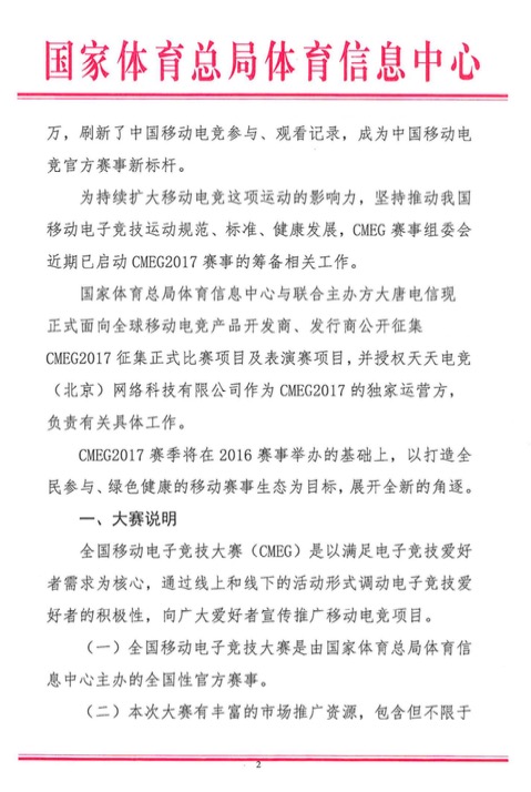 国家体育总局体育信息中心与联合主办方大唐电信现正式面向全球移动电竞产品开发商、发行商公开征集CMEG2017征集正式比赛项目及表演赛项目,并授权天天电竞(北京)网络科技有限公司作为CMEG2017的独家运营方,负责有关具体工作。