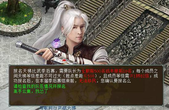 《大话西游2免费版》天梯巅峰战将在天梯比武进行到第三个月赛季结束的周四开启报名,本届报名今日火热开启,12月29日23:30至12月31日12:00期间,等级大于1转82级的玩家可组队前往皇宫找到徐茂功(或天梯接引使)报名参赛,但需满足以下条件:1,队长必须是天梯全服排行榜前500内、单服排行榜前10的玩家;2,队员之间的天梯等级差距不能过大。