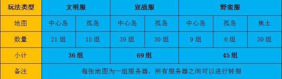 本次开放的服务器将采用三种游戏地图,分别是中心岛、孤岛和焦土。每张地图为1组服务器,分别分布在文明服、宣战服和野蛮服中,其中中心岛和孤岛地图会在文明服、宣战服和野蛮服均有分布,焦土地图为野蛮服特有地图,具体分布如下: