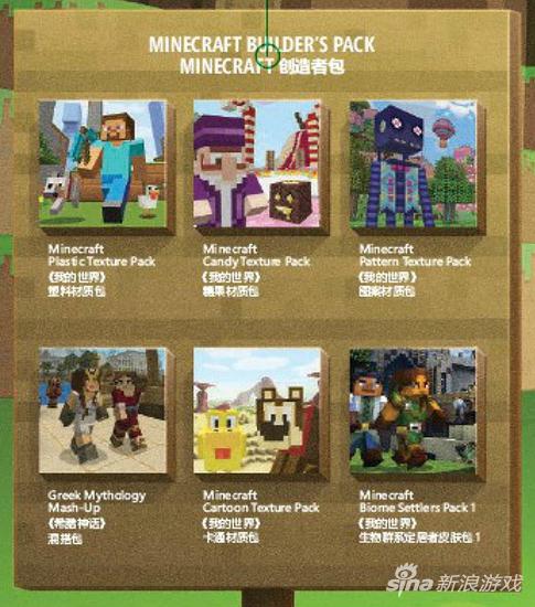 《我的世界:建造者包》:立志成为建造大师的玩家们可以通过《我的世界:建造者包》获得以下内容:生物群系定居者皮肤包(Biome Settlers Pack)、糖果材质包(Candy Texture Pack)、卡通材质包(Cartoon Texture Pack)、图案材质包(Pattern Texture Pack)、塑料材质包(Plastic Texture Pack)以及希腊神话混搭包(Greek Mythology Mash-up Pack)等丰富多样的建造素材。