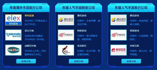 12月29日,由腾讯游戏频道主办的2016中国游戏风云榜公布了年度人气手游研发公司、年度人气手游发行公司、年度海外手游发行公司3个奖项。具体名单如下: