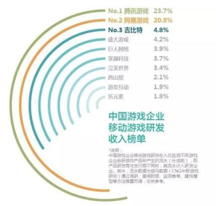 2015年7~9月,中国移动游戏研发市场排名前10企业所占份额之和约为80.8%。其中,排名前3的分别是腾讯游戏占比25.2%,网易游戏占比20.8%,掌趣科技占比9.3%。而在2016年4-6月,排名前10的除了腾讯网易之外,其他名列前茅的公司大多都是端游时代的领先者,例如排第3的吉比特,以及盛大游戏、巨人网络、完美世界和西山居等。