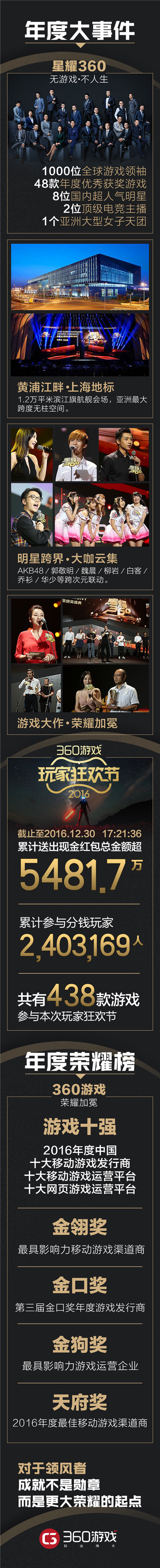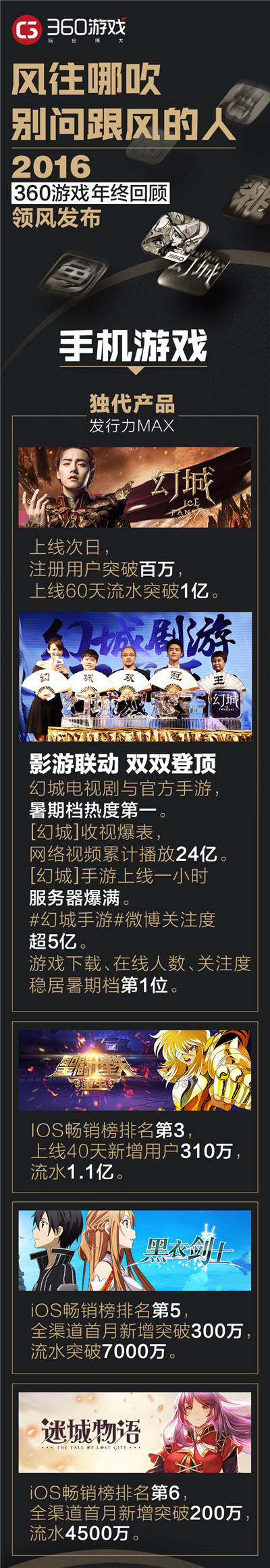 站在新一年的门槛上回望2016年,中国游戏行业进入全新发展阶段。中国游戏市场收入规模达到1655.7亿元,同比增长17.7%,继续领跑全球游戏市场。同时,行业与政府齐抓共管的局面已经形成,在游戏产业年会上,“匠心”成为被各大游戏厂商提及最多的关键词,追求更有质量的发展已是行业共识。近日,《360游戏2016年终盘点》正式出炉,从中可以看到,“影游联动”、“二次元”、“移动电竞”、“端游IP”、“精品续作”、“玩家关怀”、“页游端游化”代表了2016年游戏行业的流行风向。