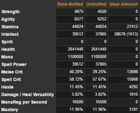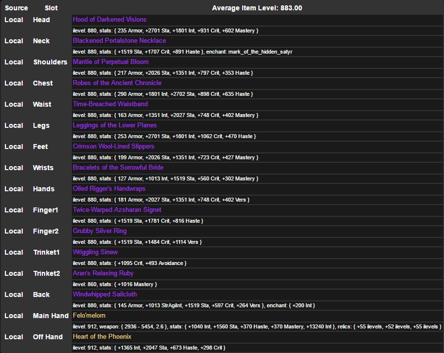 人类,神器巅峰1级,天赋1022023(0表示不点,与dps无关),三点燃圣物,装备如下图,夜之魇衣服+花环,肌腱,属性都是主暴击的。除了花环是860等级,武器是912等级,其他装备全部通过bonus id调整为880等级,保证替换橙装时的公平。