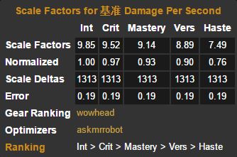 这是基础模板的绿字收益:智力登顶;暴击依然是最优绿字;精通收益相比现版本大幅提升,现在精通收益单体垫底;全能因为堆的少,又是双特效饰品,所以收益也不错;simc对急速收益的模拟波动很大,往往换一件装备就会导致收益大幅波动,所以仅供参考。