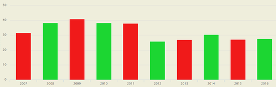MMO网站对过去10年来冬幕节礼物的领取率做了统计,其中今年的统计数据为2个月内登陆过的110级满级角色,具体数据如下: