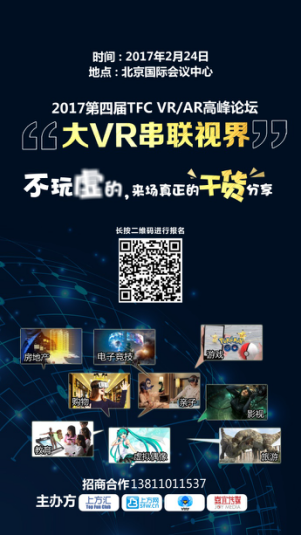 2016年,VR/AR以多元发展重塑了产业形态,从硬件、软件、内容、孵化平台、线下体验馆等多个产业链环节推动了直播、游戏、医疗、影视等多个领域的长足进步。2017年2月24日,由上方汇、上方网、酷鸟飞飞、嘉宜传媒联合主办的以“大VR串联视界”为主题的第四届TFC VR/AR高峰论坛将在北京国际会议中心举行,以干货分享、开发者大赛、制作人模式,聚合VR/AR行业精英企业,引领2017年大VR/AR的巅峰对话。