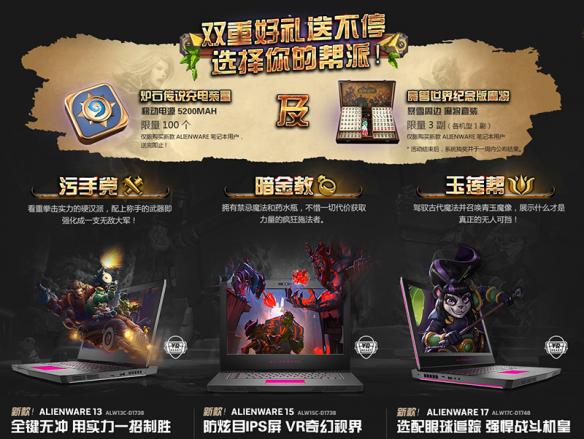 即日起至2017年1月5日,在此活动期间购买新款Alienware 13/15/17系列笔记本的朋友都有机会获得炉石定制版双重礼!移动电源及纪念版麻将套装一副,数量有限,先到先得!