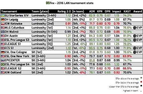 在年度首届Major赛事MLG哥伦布上Luminosity终于迎来大爆发,以压倒性优势强势登顶。Fnx以1.14的rating位列队内第2。尤其是在对阵NiP的比赛中,fnx在21局比赛中拿到+20的KDD(击杀和死亡数比)和147.7的ADR(平局每局杀伤值)。