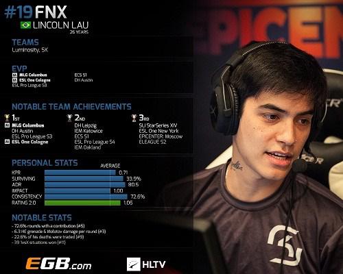 本榜单上排名第19的是来自巴西的坏小子fnx。作为队伍的关键一环,他为Luminosity/SK在年中的统治级表现——蝉联2届Major赛事冠军功不可没。在扮演角色选手的同时,fnx同样可以Carry队伍,这也让他首次进入HLTV的top20榜单。