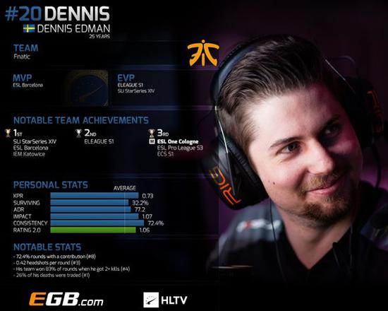Dennis “dennis“ Edman依靠在fnatic的成功在职业生涯中第一次成为hltv.org 的top 20里的一员。因为有了他的力量,继2015年的辉煌之后,fnatic在今年早期赛事里连续夺冠3次,他们是2016上半年各大赛事中强而有力的冠军争夺者之一。虽然队伍在夏季瑞典阵容大洗牌(Fnatic与Godsent人员互换)里进行了一些调整,但他仍然保持着很好的状态,且逐渐成为了这个队伍中最好的选手。