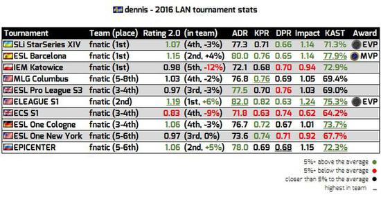 当然他也有缺点,其中之一是在多个连续赛事中的表现不稳定,他只有6次高于平均值,但他参加了10次赛事。他也缺少世界级表现在比较隆重的赛事里。当你不把ESL 巴塞罗那当作是个大赛事,因为他的大小,Eleague Season 1 是唯一一个Dennis突出的比较隆重的赛事,更重要的是,那是唯一一个赛事他是队伍里获得最高rating的。