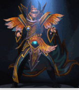 迎合鸡年活动,套装全身主要部件都是金色羽毛装饰,首先是烈焰羽尾披风,图案非常对称工整,符合主题,不过细节就相对弱一些;其次是羽毛制大肩膀,腰间还有单侧不对称凤尾搭配蓝色珠光宝石装饰,非常霸气。值得一提的是,肩膀也做成了不对称三角,和腰带的设计搭配的非常和谐。
