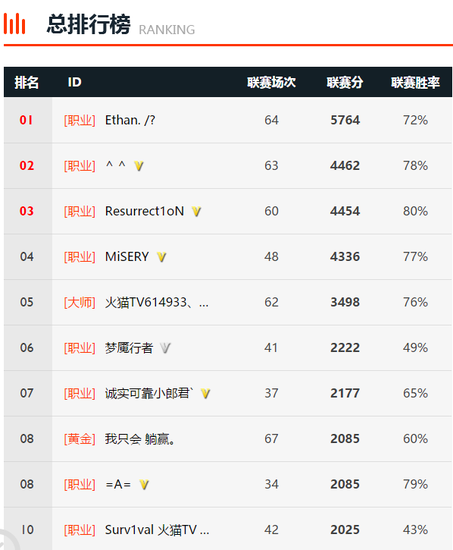 继上个赛季职业榜第一的10000元奖金被非职业玩家拿走之后,目前排在首位的依然是一位非职业玩家“Ethan。/?”,他在上个赛季取得大师组第一的优异成绩,并顺利晋级到职业组当中。M10赛季刚刚开始,他便率先取得优势,目前领先第二名超过1000分,不过,赛季才刚刚开始一周,想把这个优势保持到最后,一定要在整个赛季都保持足够的专注和努力。