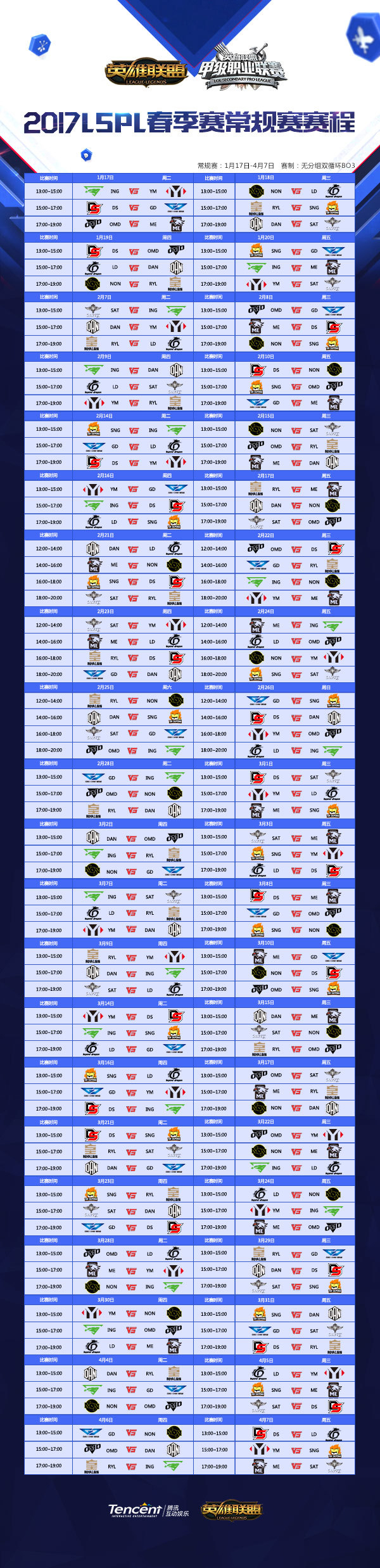 2017LSPL甲级职业联赛公布了春季赛的赛程,赛制为无分组双循环BO3 ,时间是1月17日到4月7日。