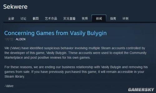 这三款游戏分别是《bOllO》《Sekwere》《。atorb》,待上架的5款游戏也都一并移除。在被下架的几款游戏的新闻页面,V社官方通知中指出,他们发现这位开发者创立了多个Steam账号,并利用漏洞来给自己的游戏狂刷好评。而这样的行为显然是V社所不提倡的,因此终止了与其的商业合作关系。