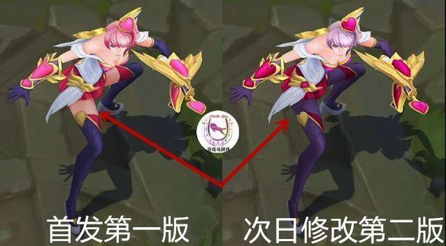 首发版的奎因,大腿部分是露出来的,由于某些技能特殊动作下奎因的这个着装会让她很“色情”,因此遭到修改。在第二天设计师就将奎因的大腿部分原本的过膝袜改成了连裤袜...
