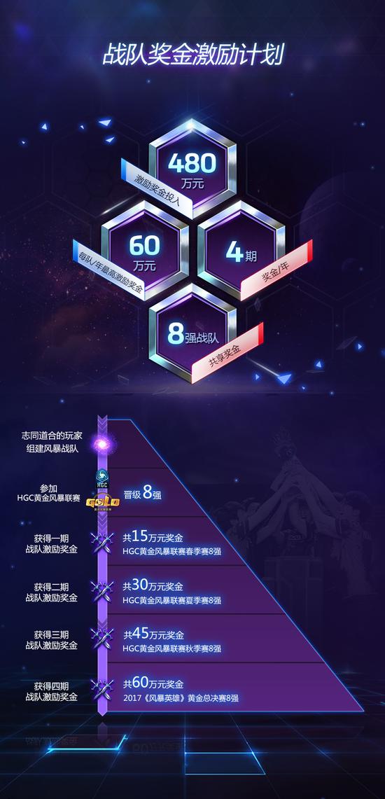 2017年度的激励奖金计划将分为四期进行,每期为8支符合资格的战队发放共计120万元的奖励,即每期每支战队可获得由网易暴雪发放的15万元战队激励奖金:第一至三期奖金将分别发放给HGC黄金风暴联赛春、夏、秋季赛8强,第四期奖金则归属于2017《风暴英雄》黄金总决赛8强。