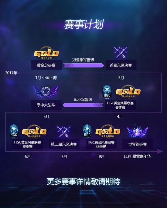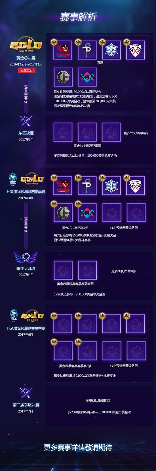 HGC黄金风暴联赛将继续作为《风暴英雄》国内最为重要的官方联赛,在2017年度迎来三个赛季的精彩赛程(春、夏、秋各一次)。每个赛季的比赛将包含8个参赛队伍名额,每个赛季的前6名队伍将直接获得下赛季的参赛资格(春季赛的6个正选名额来自2016黄金总决赛前6名),而排名垫底的2支队伍将跌入降级赛,与其他预选赛参赛队伍一同竞争下赛季的2个参赛资格。