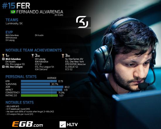 尽管他的进攻风格主动充满侵略性而导致了他在很多回合中的死亡,但是fer是唯一一位在所有比赛中取得优秀评分的选手。2016年他的稳定表现从始至终,数据表明巴西人每局人头以及ADR都算是职业选手中的佼佼者,而这也是fer能够首次进入榜单中的主要原因。