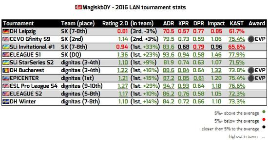 Magiskb0Y在2016年的赛事中一共三次获得EVP称号,并且在震中杯中他也只是在MVP争夺中遗憾输给了他的队友。在游戏数据中,他的每局击杀也是达到了0.79,ADR位85.4。