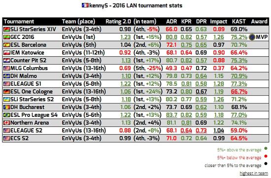 毫无疑问,16年EnVy惨淡的战绩便是如此排名的罪魁祸首之一,在16年的所有赛事上Kenny几乎都保持着队中第一的Frag贡献,但两届Major中战队令人大跌眼镜的表现。。实在是很难提升他的排名了。