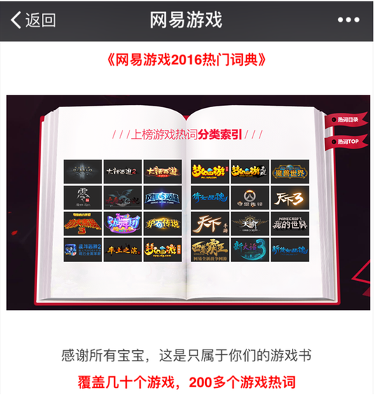 除了前文提及的游戏化互动之外,公众号常规也需要游戏化的运营。目前,几乎网易游戏旗下热门产品的每一个公众号都开通了福利功能,类似积分、宝箱、签到等功能十分常见。归根结底,运营一个公众号的终极目的,不只是聚集一群活跃粉丝,而是在踏实做好互动与内容之上,运营和构建起属于一个玩家圈层的文化,从而打造粉丝与品牌之间的深度精神黏性。正如最近网易推出的《网易游戏2016热门词典》,也是试图将品牌影响力渗透到玩家在游戏之外的圈子文化。而在其公众号上推出的游戏热词填字游戏,无论是互动率还是阅读量,都非常高。评论区的粉丝纷纷表示“智商不足”、“被玩坏了”,这也再一次证实了玩家对于游戏文化的需求与认同。