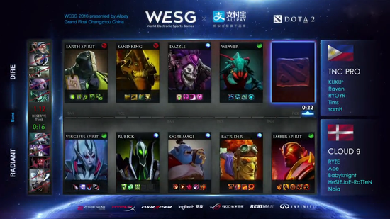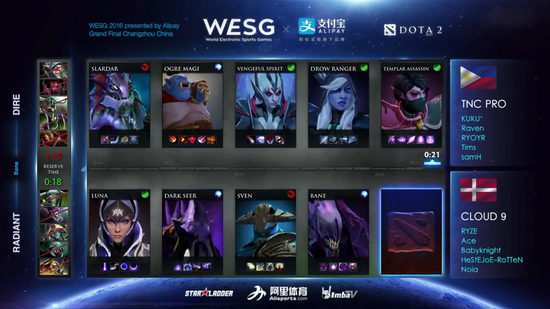 WESG全球总决赛DOTA2项目决赛,最终在TNC和C9之间展开,中国队伍在自相残杀一轮后双双被对手淘汰,被阻拦在了四强之外。上古巨鱼Loda战胜SG e-sports之后被TNC轻松击败,将和INFAMOUS展开三四名的争夺。