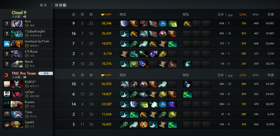 首场比赛C9阵容选择火猫中单和VS打大哥,TNC则是中单剑圣大哥蚂蚁的传统后期,开局C9想依靠蝙蝠的强势开雾冲进了TNC野区,然而被开着剑刃风暴的剑圣赶跑还被追死了两个人。对线期TNC辅助土猫和大哥蚂蚁主宰了整个局势,15分钟C9才依靠蓝猫卖肉才打出了2换4的第一波优势。23分钟C9带盾冲击夜魇下路二塔,被TNC开雾包了屁股,不朽盾和5个人的性命一起交出。C9经济逐渐处于下风还有VS这种略显尴尬的大哥,而TNC的双大哥每波团都能完成收割,之后跳刀沙王配合土猫抓死一波土猫没有买活,TNC一波拆掉C9三路兵营,C9还在不停的减员,感觉翻盘无望的C9无奈打出GG。