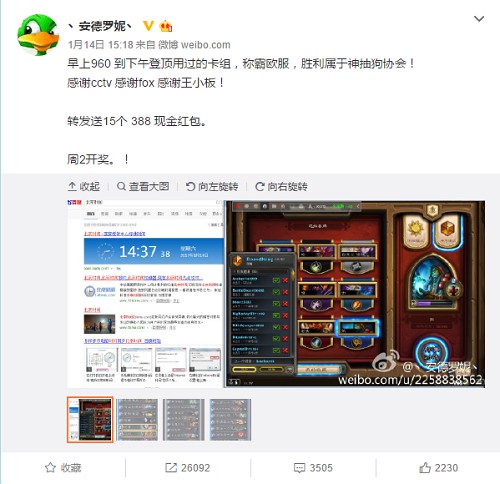 1月14日北京时间14:37分,炉石圈又传来一件轰动的消息。虎牙直播会长安德罗妮征服欧服诸神,奇迹贼登顶欧服成功,为国服玩家长脸啦!登顶之后会长也比较激动,为了感谢军师们一路以来的支持,安妮会长发微博庆祝,并且特意准备了豪华抽奖活动感谢老军师们!