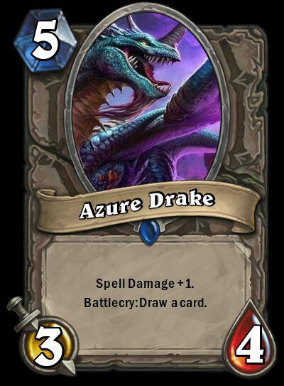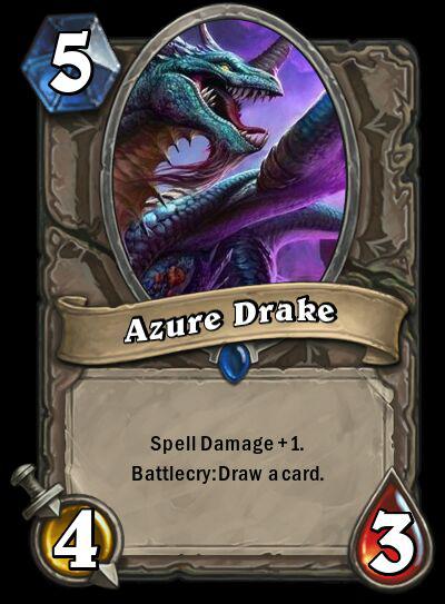 这里是参考“地精大战侏儒”扩展包里面的“布林顿3000型”,布林顿是5费3/4的身材,缺乏的攻击力可以用它战吼给你装备的武器来弥补。所以我想,碧蓝幼龙战斗力削弱的1点可以用法术伤害+1来弥补。