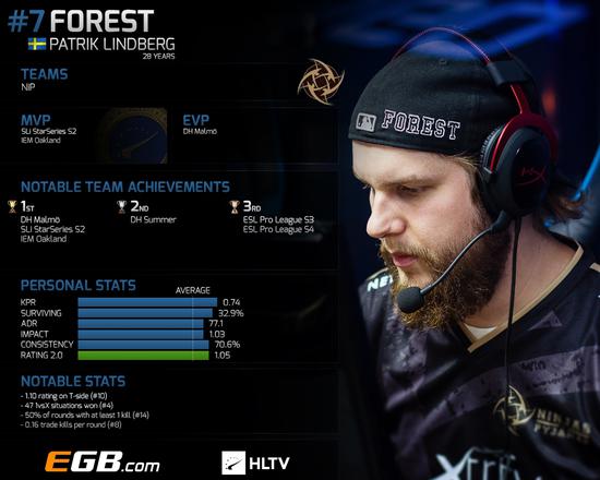 今年年度选手第7名是Patrick “f0rest” Lindberg。他在今年持续稳定的高水平发挥使得他成功从2015年的第9名上升到了今年的第7名。