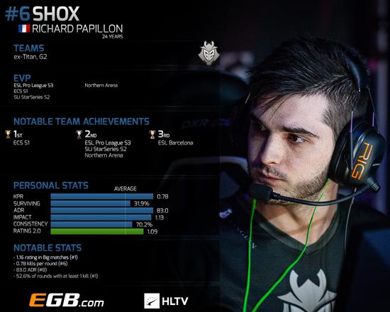 本年度top20第6位的是Richard “shox” Papillon,作为G2的IGL,他获此殊荣当之无愧。这也是自2013年后shox获得的最好排名。