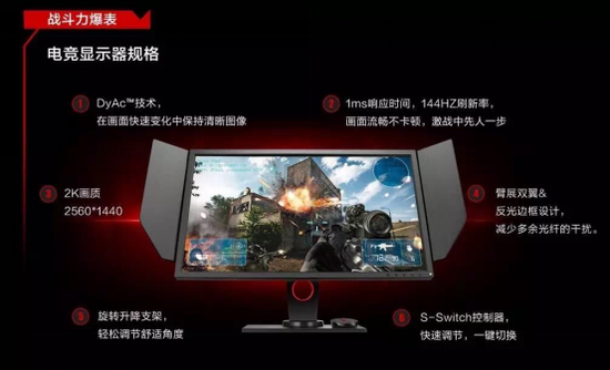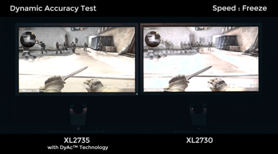 相对“老机皇”XL2730来说,XL2735增加了特有的DyAcTM显示技术,DyAc技术是在现有液晶显示技术的基础上, 发展的能改善动态画面影像清晰度的显示技术。带有DyAc技术的显示器,比起一般显示器, 能更清楚呈现显示画面中的移动影像。为此,主办方特别提供XL2730与XL2735,在刷新率一样的前提下,启用DyAcTM技术的XL2735在显示运动对象的时候,更清晰、更锐利,其对于视觉清晰度的提升是肉眼能够明确感知到的,针对激烈操作的PC电竞游戏, 例如第一人称射击类遊戏, 能让玩家看清楚画面中的动态影像, 提高遊戏表现,这对他们的提高命中率是很大的作用的。