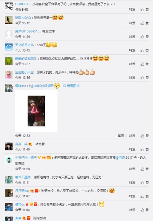 不过想到转会前小狗受的委屈,狗粉们就都想借着UZI转会的大喜,为UZI再组织多几次狂欢,1月20日UZI的虎牙直播首秀自然是要支持,却也控制不住要用其他方式为偶像加油打气了。为了满足粉丝们的需求,虎牙直播现已发起“一句话证明UZI最叼,助攻我狗上头条”活动。这次活动作为直播首秀的前哨战,LOL吧及UZI贴吧一公布就瞬间引爆了粉丝们的热情,公告帖子下面的楼层已经盖到飞起,在微博参与活动的人数也不断攀升,狗粉大军的庞大、UZI人气的高昂,都一目了然。