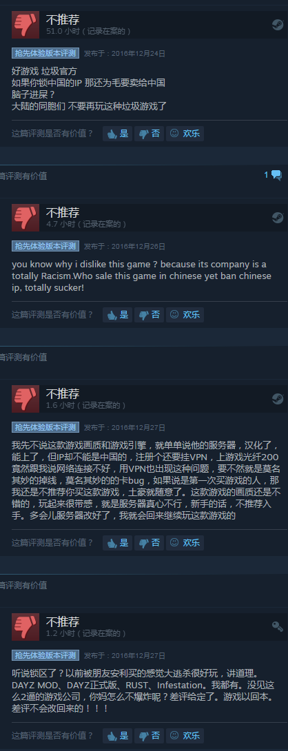 值得注意的是,这款游戏在Steam的整体评价并不高,只有65%。主要原因之一是,国区玩家刷了大量的差评,大部分都是因为官方封锁了大陆的IP,玩家如果不使用代理服务器的话将无法登陆。而另一方面,这款游戏并未停止在国区销售,并且还自带中文。国区玩家固然对这款游戏有很多不满,但它的热度并未因此降低。