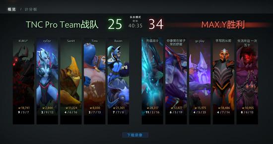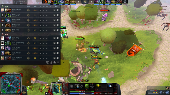 TI前八的TNC战队和MAX.Y的对抗或许是今天最高规格的战斗了,几个中国天梯的小伙子选出了龙骑TB毒狗的推进体系,毒狗还可以克制对面的露娜和影魔。TNC前期在蓝胖VS和沙王的节奏带领下取得了一定的优势,MAX.Y双变身英雄在中期都出到BKB之后开始展现出威力,团战打退TNC一波之后,不理智的冲高地送掉了三个人头,TB只能选择BKB回城。互刷了一阵子之后,MAX.Y凭借分身TB和毒狗制造幻想要尝试逼一逼TNC的高地,TNC蓝胖先手被秒掉,影魔没有BKB之后被龙骑跳T击杀,露娜也被换血杀死,MAX.Y龙骑被换掉之后成功破路,对面沙王买活选择留人被TB直接点死,还赔上了一个露娜死后买活,一波血崩。之后中路双方大打出手,打出自信的MAX.Y有些大意,一波惨烈的鏖战最后只剩毒狗一人存活,TNC还付出了中路近战兵营的代价。之后的一波团战大鱼跳踩、DS拉四个,影魔LUNA已经无法和TB龙骑正面硬刚,只能打出GG。