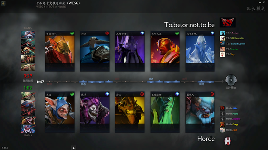 第二局比赛TOT前两手光法娜迦就确定了整场比赛的节奏,Horde前两手拿到大屁股和小精灵,后面几手看起来有些诡异,最后的大哥巨魔更让人摸不到头脑。光法双头龙赏金的TOT战队线上弱势比较明显,无法阻挡对面的发育,就算带节奏也只能是火猫强行去带,控制只有光法的法力流失和出到风杖的双头龙,巨魔在小精灵的辅助下如入无人之境随便突随便砍,25分钟所有外塔全破,之后出到羊刀的黑鸟隐刀突进,多次轻松秒掉小娜迦,感到翻盘无望的TOT在35分钟打出GG。
