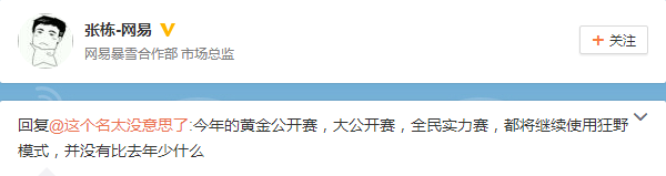 退环境之前,网易暴雪合作部市场总监张栋曾经宣称除了和嘉年华赛事选拔有关的职业联赛外,包括黄金公开赛、大公开赛、全民实力赛,都将继续使用狂野模式。